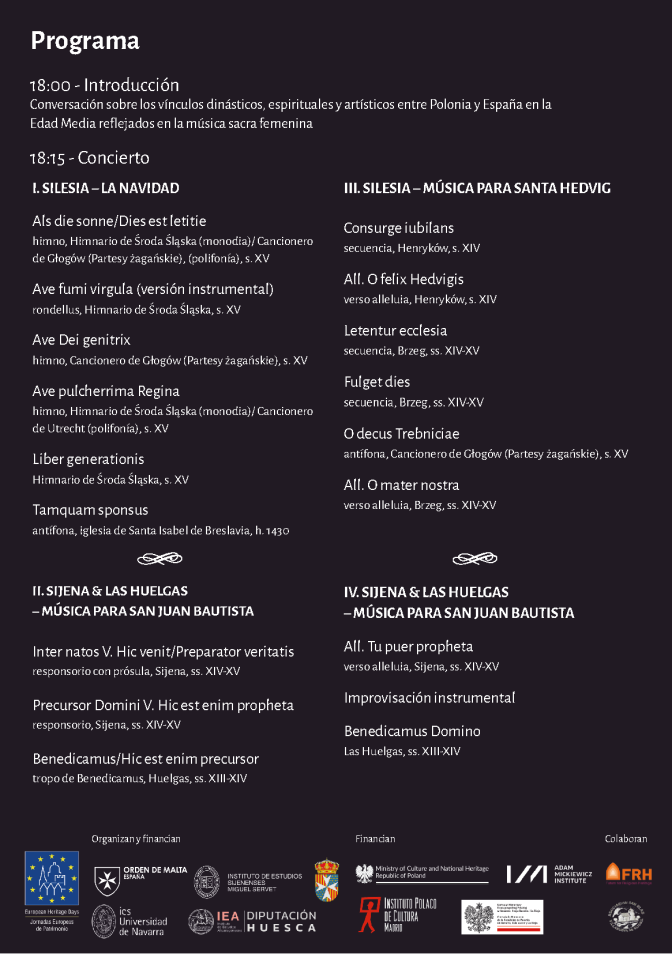 Those involved included Anna Dulska from the University of Navarra and the Spritus Movens of Sijena, the Order of Malta and this very day; Sister Virginia from the Sijena Sisters branch; Juan Naya, born in Sijena and a great propagator of the monastery and its famous collection of wall paintings; and the ensemble Peregrina, who first recorded and performed the music for St John the Baptist in this format. The event was organised and supported by the Institut Adam Mickiewicz, the Institut Polski w Hiszpanii, the Ministerstwo Kultury i Dziedzictwa Narodowego, the Malteserorden Schweiz and Espana and the Institut Miguel Servet in Villanueva de Sijena.